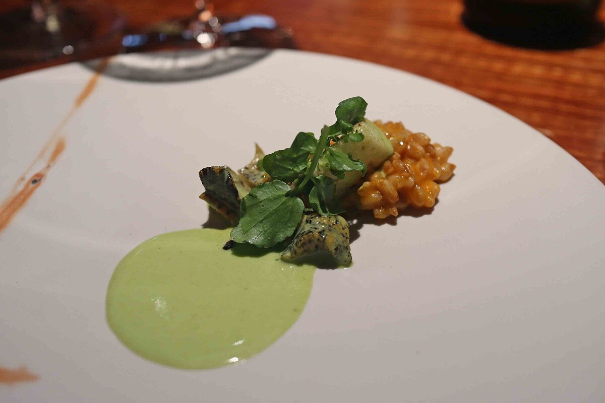 Chef Yao 也特別提到:「因為巴斯克料理中有很多烤蝸牛或是烤田螺的做法,我們這次想在這個季節做一道類似風味的菜,帶有一點酸味。這道菜搭配了當季的竹筍,因為我們離竹筍產地很近,所以用新鮮的竹筍。而在法國,我也相當喜歡斯貝特小麥製作的食物,但在台灣比較少見。最常見的是酸種麵包裡會有斯貝特小麥。在法國,他們也會用斯貝特小麥做燉飯,有時候也會用來做沙拉或涼拌,類似於couscous的做法。這樣的組合帶有口感,我自己相當喜歡。」