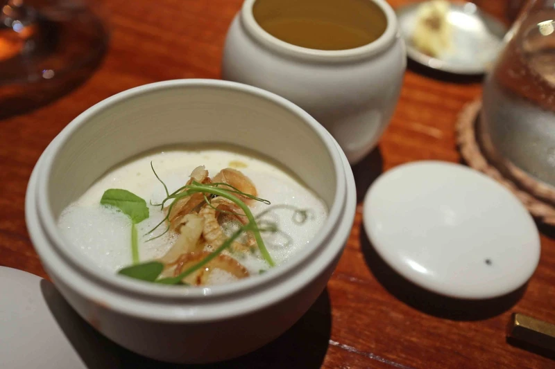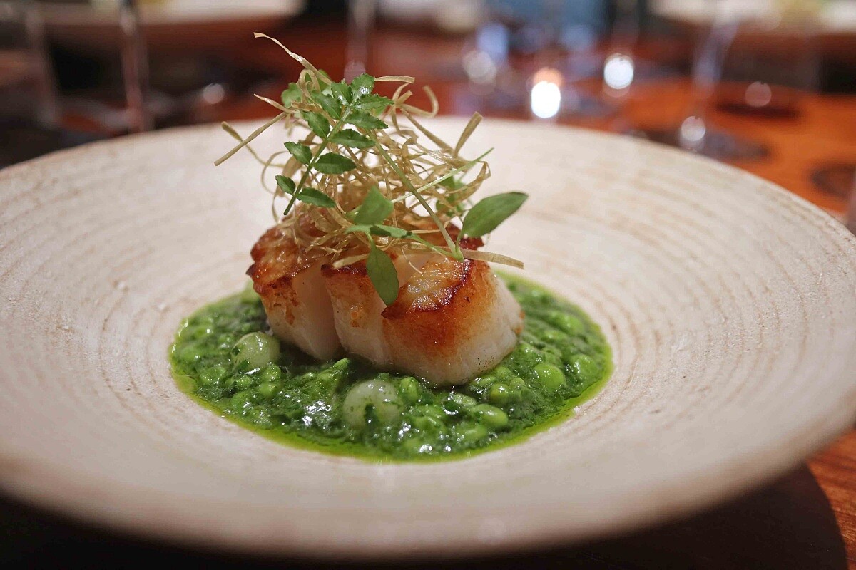 這道料理以北海道干貝香煎呈現,底部鋪上芹菜根泥與夏季燉菜,燉菜部分以長時間熬煮大頭菜的高湯,去燉煮菠菜、甜豆與大頭菜,干貝上方鋪上酥炸白板昆布、木之芽與西洋芹苗。除了視覺帶來綠意,也吃進綠色食材帶來的芬芳清香。