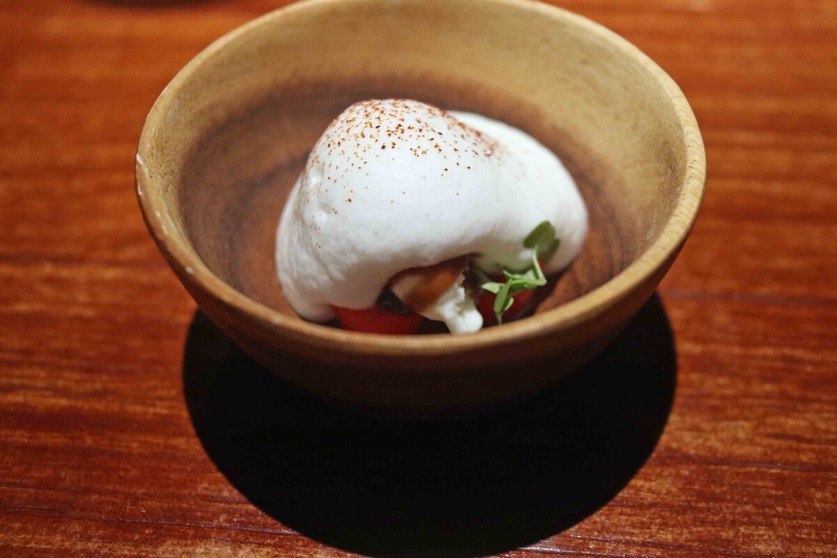 前甜點餐廳以起司做發揮,因為在法式餐廳有習慣在吃完主餐後,甜點之前先來點起司盤清除味蕾或休息,我們選用的是布拉塔起司做成冰淇淋與慕斯,下方為新鮮的陳蜜香番茄、聖女番茄與燈籠果,滴上羅勒油,上方淋上陳年醋膏、灑上番茄粉,這道菜是以卡布里沙拉Caprese為概念。而整道菜的概念又好似經典卡布里沙拉,有羅勒番茄的鹹香跟甜美。