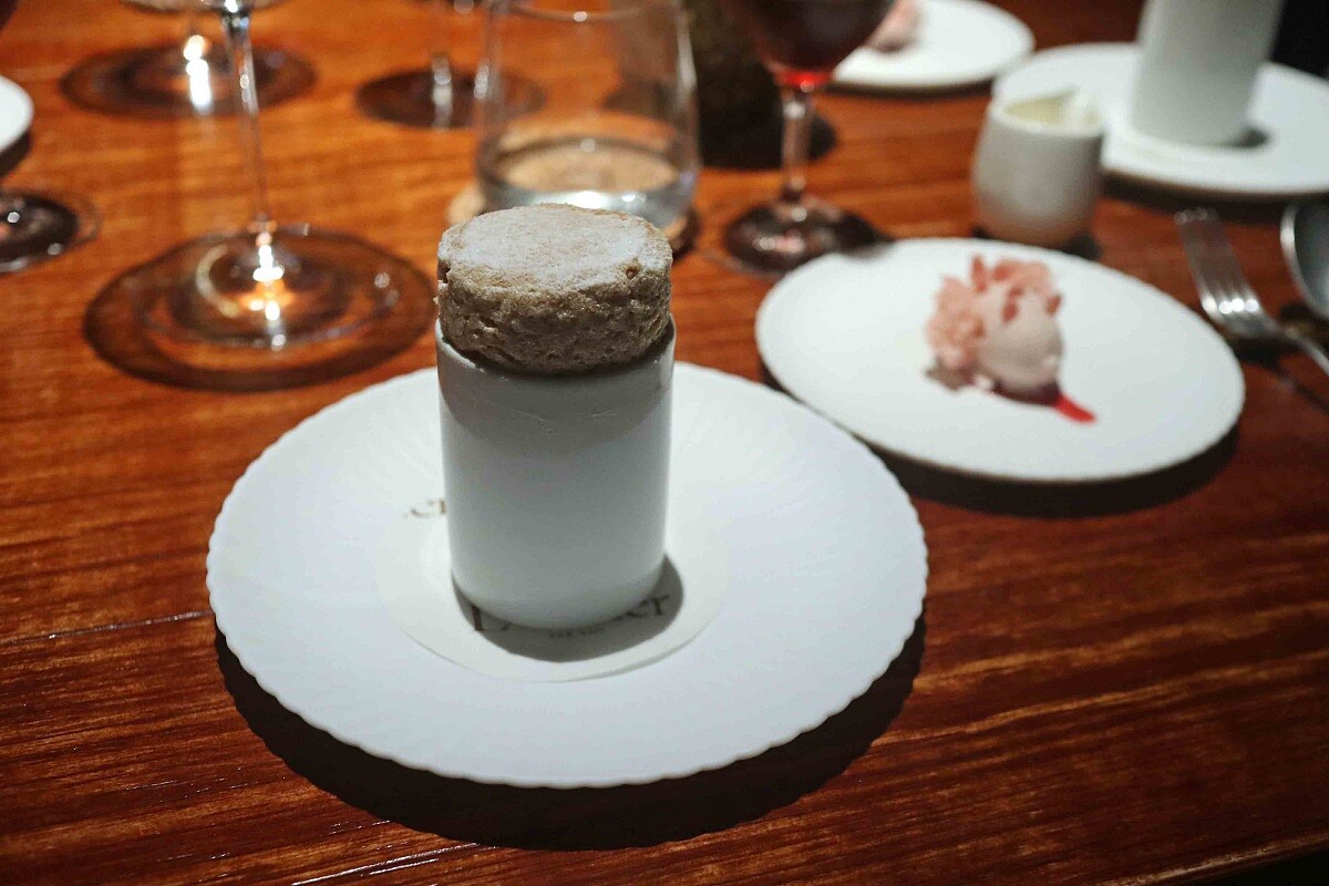 主甜點帶來現烤黑糖舒芙蕾,這道甜點有著自己的諺語:「只有人等舒芙蕾,沒有舒芙蕾等人。」用來顯示這道甜點需要主廚深厚的技巧以及對時間的掌控,才能展現出完美舒芙蕾的「嬌貴」。此次以櫻花為主題,底部為新鮮草莓楊梅及櫻花蛋白霜,上方為櫻花冰淇淋、櫻花海綿蛋糕及脆片,最後附上的是甘酒 Cream,建議先在舒芙蕾上方挖一個洞,將冰淇淋放入一同享用,鹹甜的風味。