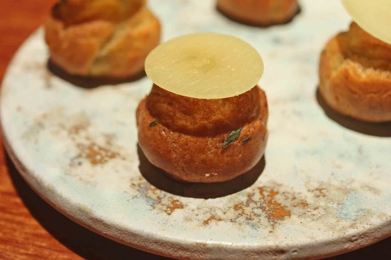 經典的起司泡芙,內餡加入以36個月的康提起司與黑松露,泡芙上方為康提起司薄片,可以品嚐到兩種不同狀態的起司風味,泡芙加入些百里香增添香草風味。