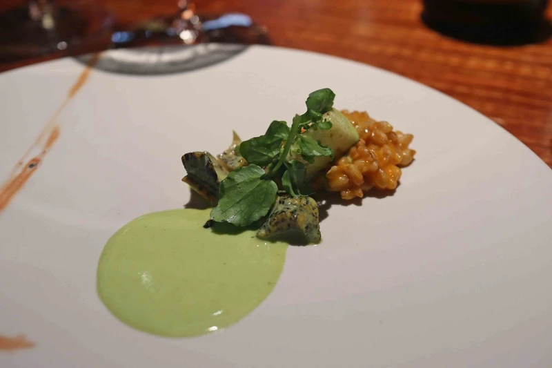 選用海螺,醬汁以法國在吃蝸牛時常見的醬汁作為搭配,為蒜味奶油配上巴西里,一旁橘色、吃起來像燉飯口感的是斯貝特小麥,以海膽辣醬與發酵蔬菜汁烹煮而成,其中還搭配以清酒昆布醬油煮過脆口的竹筍,讓整道菜擁有不同層次的口感,能享受到分開吃、一起搭配享用口感變化的樂趣。