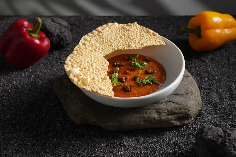 則將紅甜椒、煙燻紅椒粉、腰果等食材製成核桃甜椒泥,搭配上黑糖核桃碎、美乃滋以及烤至脆口的印度脆餅,在溫潤的堅果香氣中仍帶有些許的開胃刺激,脆餅半月型的形狀,也呼應雲川水月的月亮圓缺印象。