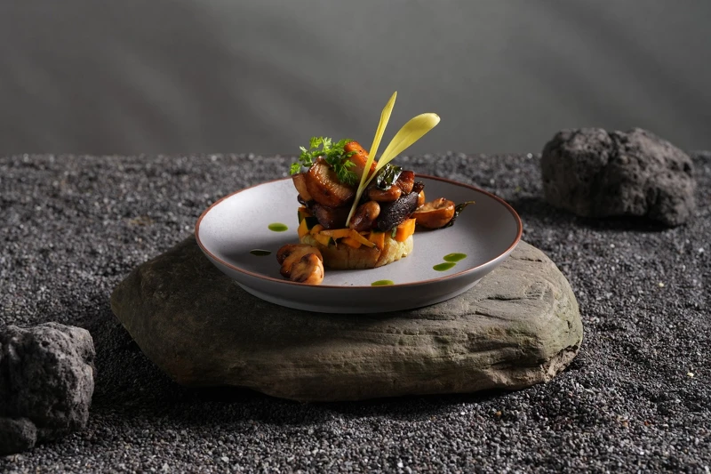 以法式薯泥概念為出發,將日本栗子南瓜、台灣本土栗子南瓜巧妙結合,再鋪上以日月潭自然醋醬汁翻炒的季節野菇,在清甜與微酸滋味中,也同時享有綿密、滑嫩、彈性的豐富口感。