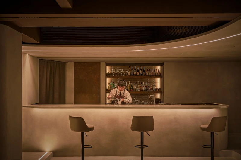 室內用餐空間取自天然石窟為基礎,利用不對稱的弧線和拋物線式的光源,展現出洞穴般的穩重感。米白色調象徵「雲川水月」的雲色,也像歷史痕跡的溫潤靜謐。包廂內斜天花板特別吸睛,加上均光圓形和弧形石洞窗,彷彿置身土耳其卡帕多奇亞的洞穴教堂,展現侘寂的缺憾之美。