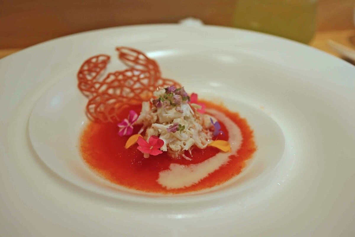 首道料理使用宜蘭花蟹為主要食材,搭配上紅椒與番茄製作而成的醬汁為基底,白色醬汁則為起司,鋪疊上鮮美的蟹肉,並以 Tabasco 辣椒醬提味,最後點綴上清香的紫蘇花。明亮的酸度與微微香辣的風味,讓人不禁想起西班牙冷湯,為食慾不振的夏日捎來一股開胃的風味組合,此道料理將視每日食材限量供應。