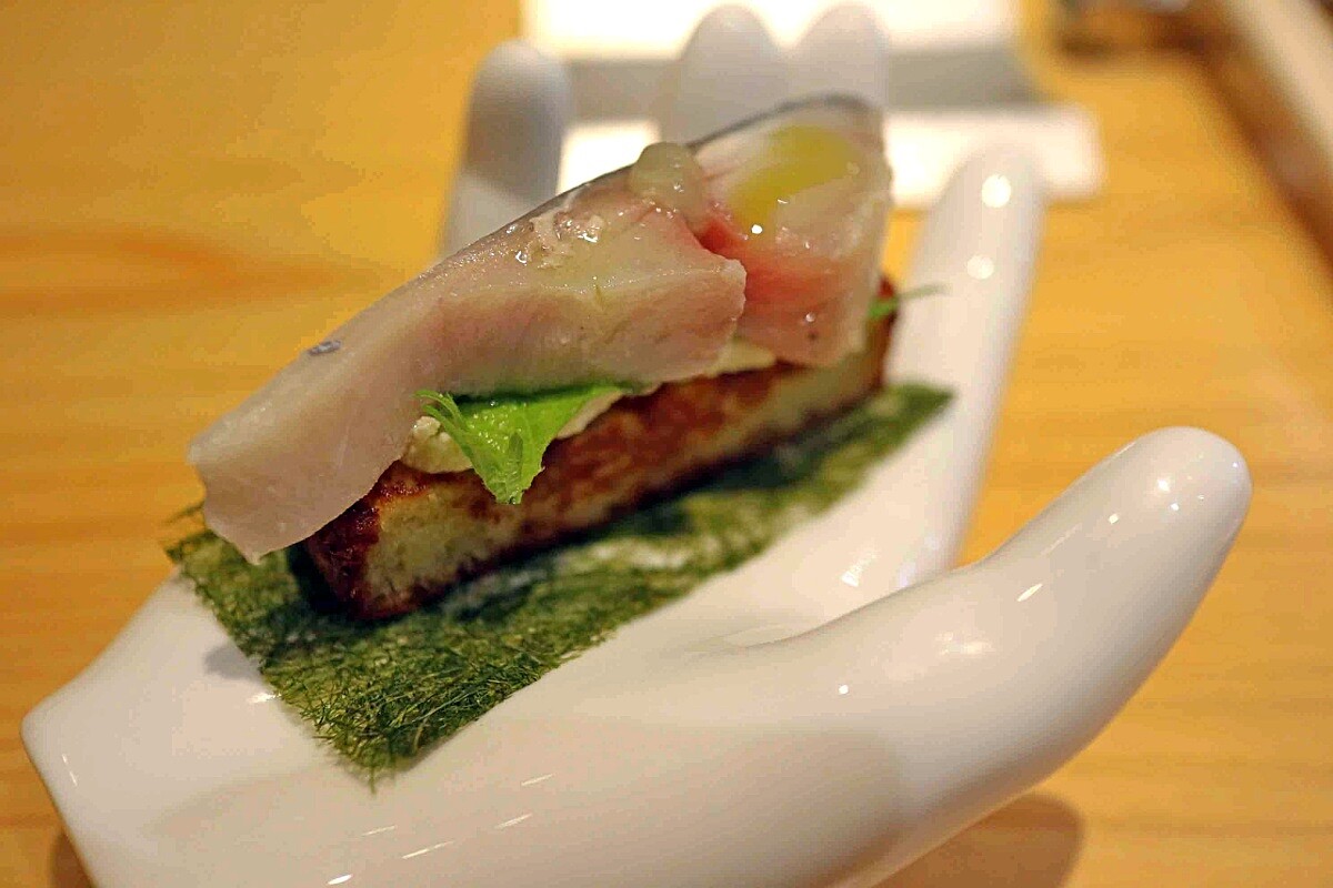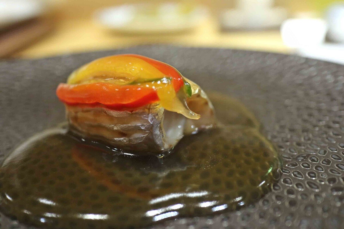 選用新鮮的法國吉拉多生蠔,結合以蛋黃為基底加入洋蔥、蝦夷蔥的沙巴雍醬,表面炙燒呈現類似焗烤的口感,最後堆疊上壽司芳的魚子醬,以湯匙由上往下把所有風味一口嚐盡,生蠔的乳香搭配上滑順的醬汁,濃郁的風味在口中綻放,口齒留香。