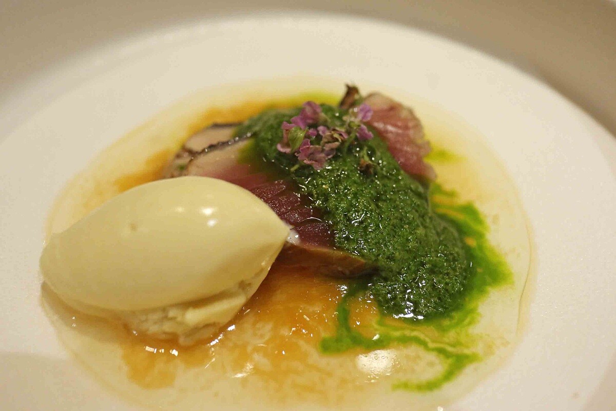 以半敲燒的傳統做法,使用日本鰹魚以越光米稻草燻燒後將油脂逼出,再將沾染上稻草香氣的魚肉切片,搭配上蒜薑醬汁與帶有橘色色澤鯷魚酸豆巴西里醬。一旁有乳白色的冰淇淋,是以第戎芥末製作而成,因為加入牛奶製作成冰淇淋,因此味道柔和細緻,少了原本刺激嗆辣的風味,讓魚肉帶有清香的風味。
