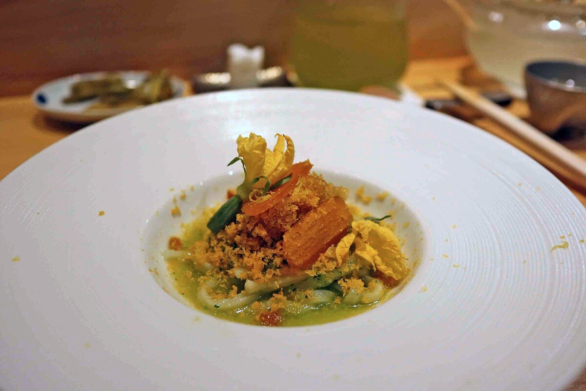 這道料理相當費時,烏龍麵是主廚自己製作,要先和麵接著發酵5~6個小時,再桿成適當的厚度後以手工切割,讓口感更加突出。主廚取小黃瓜與紫蘇的風味作為醬汁基底,搭配上飛魚卵,最後以小黃瓜花作為點綴,並刨上鹹香的烏魚子。烏龍麵既Q彈又清涼爽口,每一口還有飛魚卵的脆彈,讓口感多了豐富的層次。