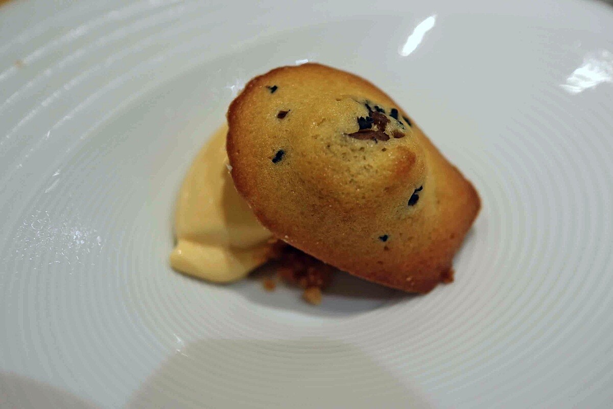 甜點再次展現了主廚的玩心,將冰淇淋製作成瑪德蓮蛋糕的風味,搭配上加入松露配方的瑪德蓮蛋糕。濃郁的蛋香,與帶有堅果香氣的松露意外合拍。