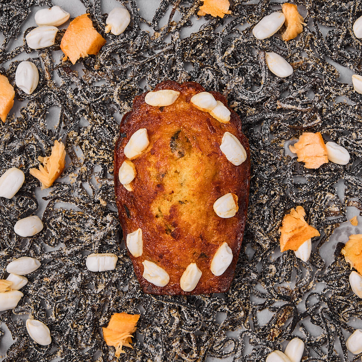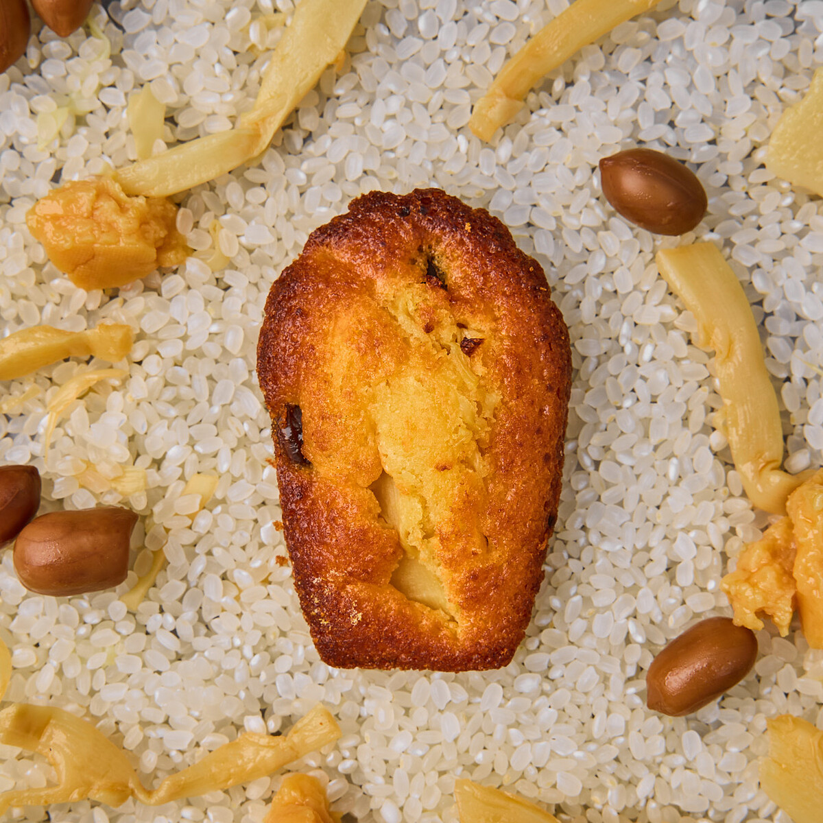以日本傳統早餐為靈感,融合鹽漬鮭魚、鹽昆布、味噌和糖漬柚子皮於小巧的瑪德蓮中,搭配米香和澄清奶油糕體,呈現出獨享的視覺與味覺饗宴。