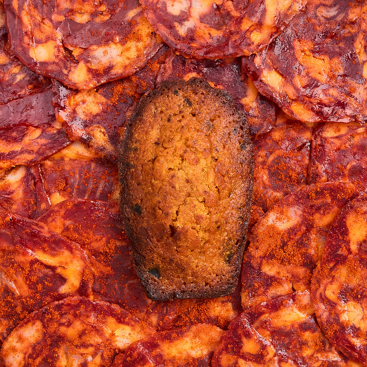 將西班牙的熱情煙燻紅椒香腸帶入瑪德蓮,經加熱後釋放出層次豐富的煙燻與微辣,搭配肉感咬勁,彷彿一口口享受半島風景下的滋味。