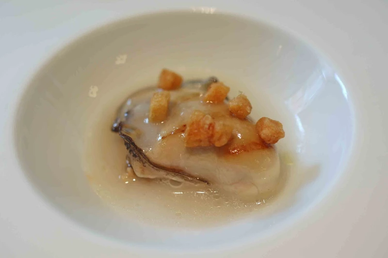 選用來自法國西岸的小甜心生蠔(Belon oysters),肉質飽滿,外型扁平且呈橢圓形。在底層鋪有澳洲培根、刺蔥和酸黃瓜丁混合而成的內餡。將蛤蜊慢炒製成的醬汁淋在上面,最後撒上一些炸過的豬肉皮增添口感。用湯匙一起挖起底下的香料和生蠔,能品嚐道完整的口感和風味。
