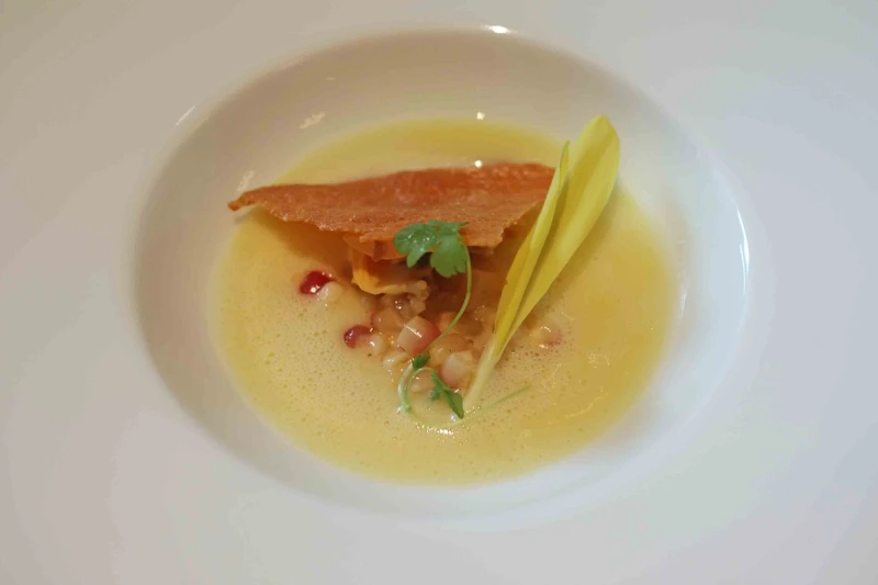 這道菜結合了干貝、小卷和綠竹筍,將夏季的海味山珍融入一碟。每年六到八月是小卷的產季,這道菜使用北海道生食級干貝和小卷炙烤上色,呈現出鮮甜彈牙的口感,並用法國烏魚子增添海味。綠竹筍在這裡以三種方式呈現,分別是鮮筍薄片、綠竹筍泥,並淋上用竹筍和干貝低溫慢煮的鮮美高湯。冷壓黑芝麻油和大紅袍花椒油調味,讓食材的甘香更加突出,上方散落著山當歸苗、香蜂草、紅酢漿草和馬約蘭,為這道夏季沙拉增添了明亮清爽的風味。這道沙拉口感豐富,時而帶有檸檬和香草的清香,時而流淌出泥土與草本的幽酸,層次繁複,滋味絕妙。
