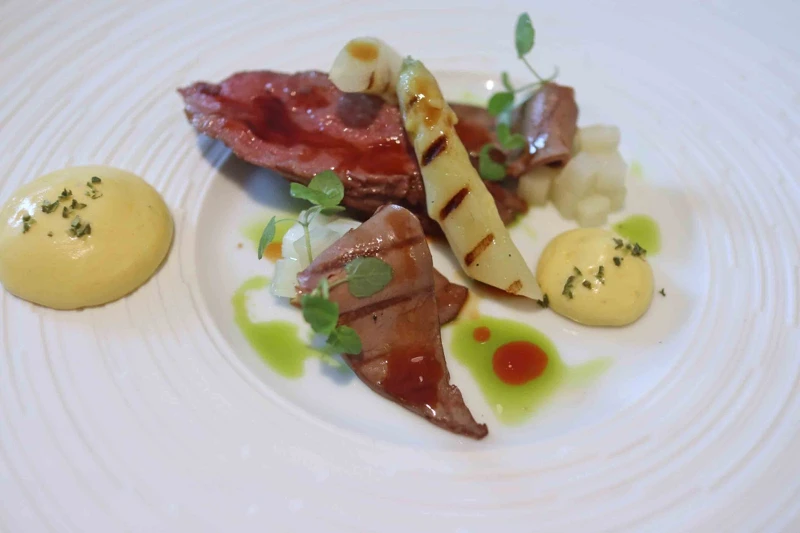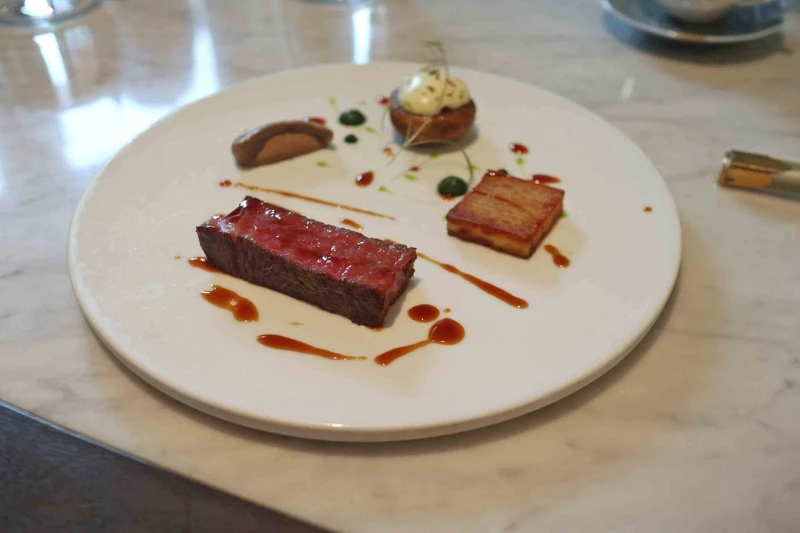 主餐中的澳洲純種老和牛帶來最豐富的風味饗宴。這些牛因長時間的飼養而味道格外甜美,香氣濃郁,讓人回味無窮。用炭火烤製的油菜葉泥,搭配牛肉的陳年香氣,相得益彰。香濃的蘑菇填充了洋蔥、茴香和炒過的牛絞肉,再加上 Gruyère 和 Comté Cheese 的慕斯覆蓋,灑上香料增添層次感和辛香味。馬鈴薯千層和蘑菇泥為菜餚增添了豐富的口感,最後以茴香油和牛肉醬汁作點綴,最後撒上新鮮的茴香碎,營造出清新的草本氛圍。