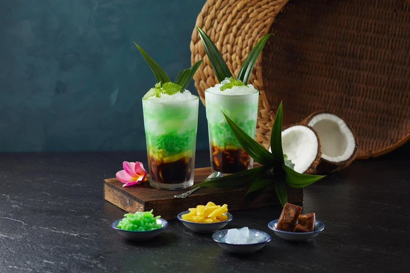以香蘭葉汁與糯米粉做成綠色粉條,標配椰奶與椰糖,外加波羅蜜、亞答子、椰果,香甜又清涼爽口。