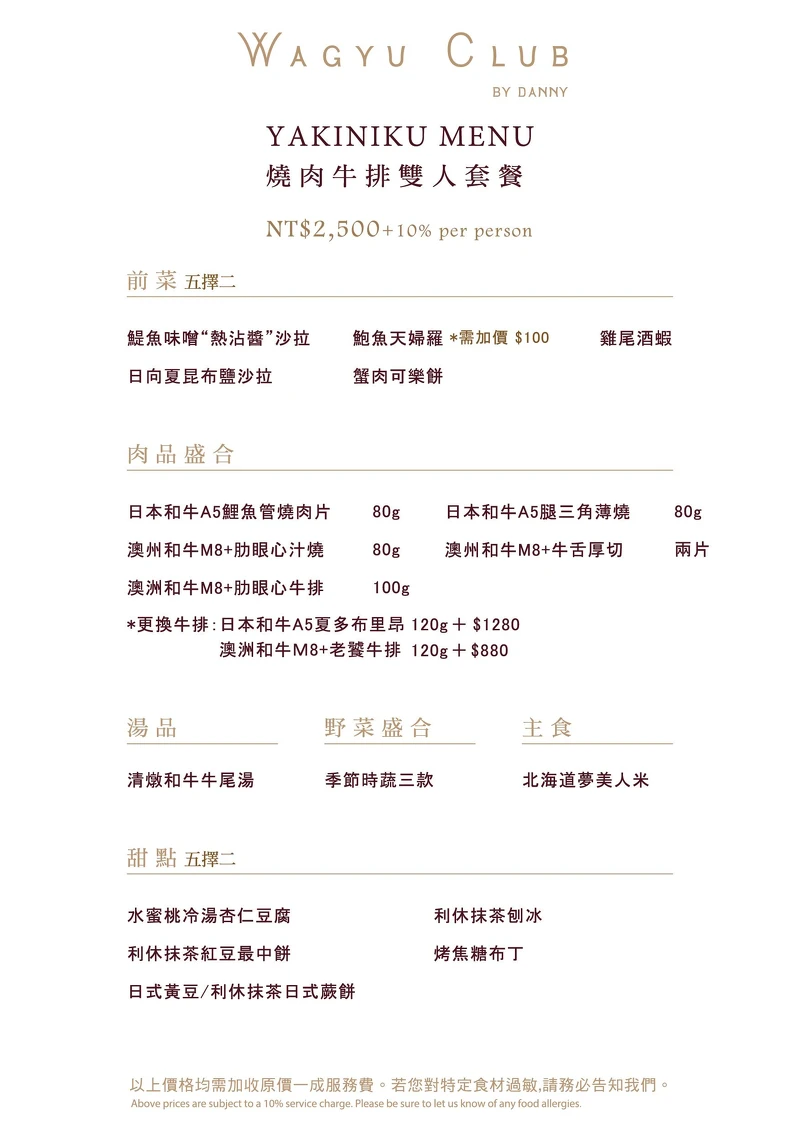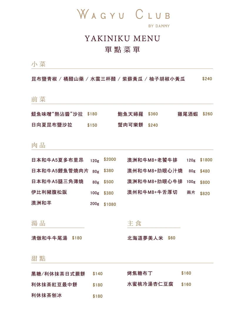 WAGYU CLUB採分階段性營運,首波燒肉於7/18日開放訂位,全和牛燒肉雙人套餐每人2,500元,對此鄧有癸透露自己想做燒肉很久了,想要打造一間不用花大錢就能吃到高品質和牛的餐廳,「日本燒肉市場還在成長,但不管價格高低,每一個價格帶都有相當穩定的水準,在哪個價位都能吃到最高的表現。」