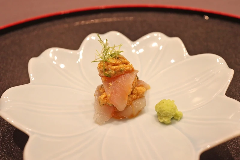 外觀呈現銀白色的岡山的鱚魚(岡山の鱚魚),其肉質細嫩味道清甜。搭配上來自沖繩的明蝦,主廚以90度熱水稍微汆燙,透過短暫的高溫提升明蝦的甜味,最後淋上柚子胡椒醬。