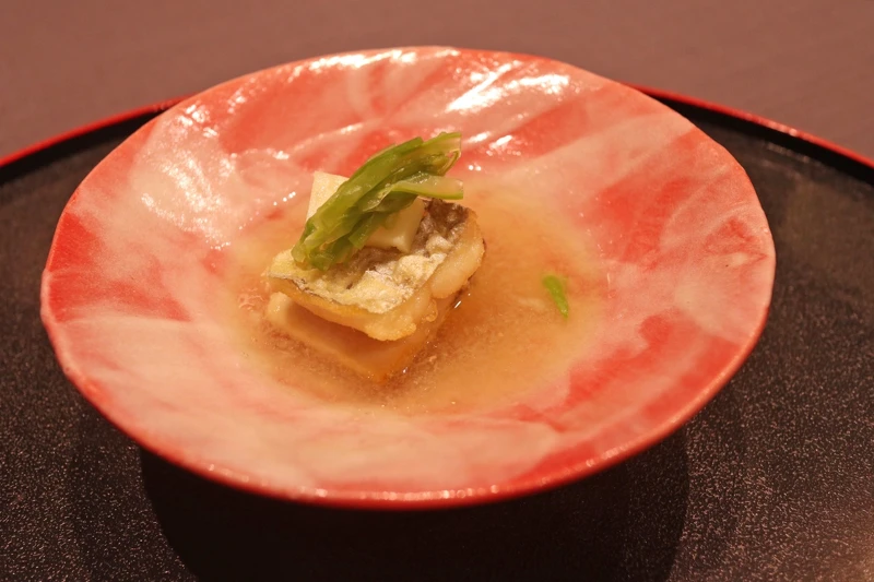 來自日本岐阜縣的香魚,因為先經過烤製的程序因此外皮呈現焦脆鹹香。柴魚乾顏色較深的「血合肉」有高含量的鐵質,味道帶有腥味,因此料理長也特別使用不帶「血合肉」的柴魚片熬製,才能呈現高湯高雅清香的風味。最後在高湯上方刨上青柚皮,為湯品帶來了清新的果香,而日本蓴菜、秋葵則帶來了口感層次。