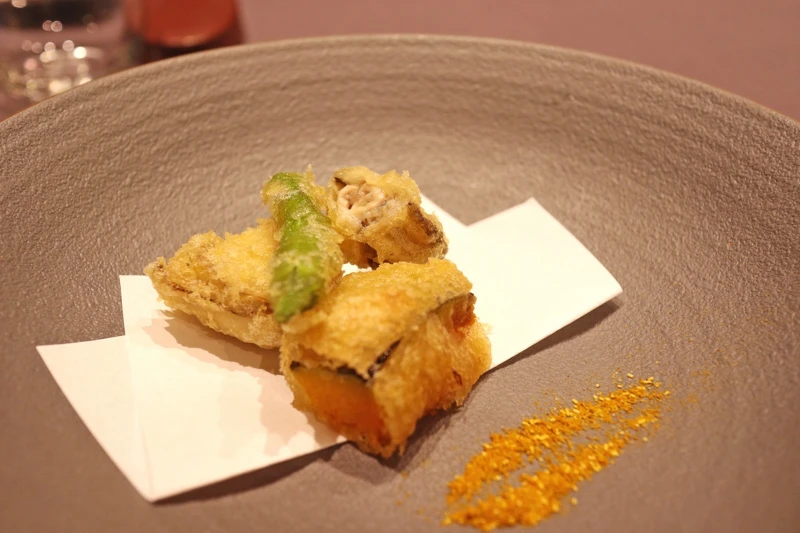 選用北海道厚岸牡蠣酥炸,搭配上南瓜、獅子唐(日本青椒),可沾取料理長自製的咖哩鹽,增添香氣與食趣。