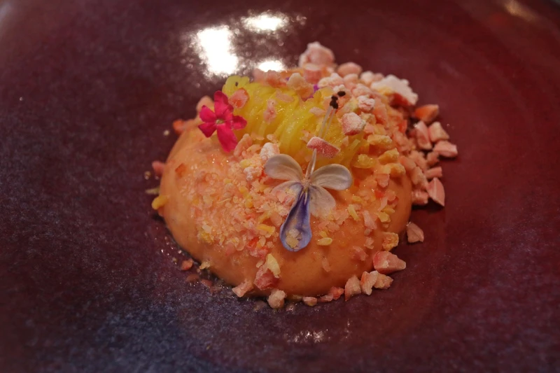 以新脫俗的「繁星花」與隨風搖曳的「竹葉」作為開場,它們都是經年圍繞在樂埔薈所的植物。如紙的筒狀脆餅綴上白花椰菜泥,入口薄脆有聲,綴以楓糖的香氣。而繁星花是台灣常見植物,其花語有多種說法,Chef Josh 則取其花語之一:「創造與創新」,宣告「樂埔薈所」以全新的樣貌展現。