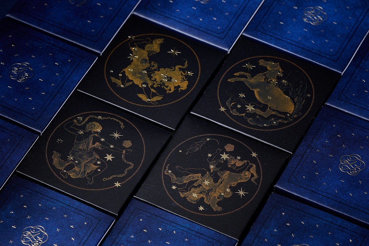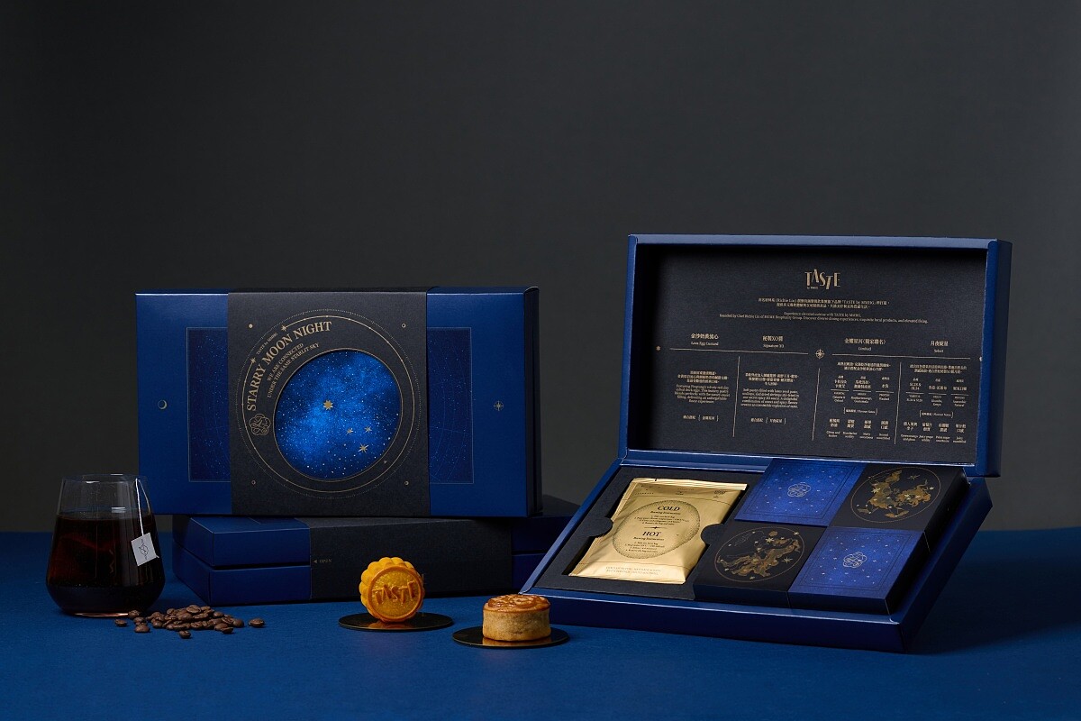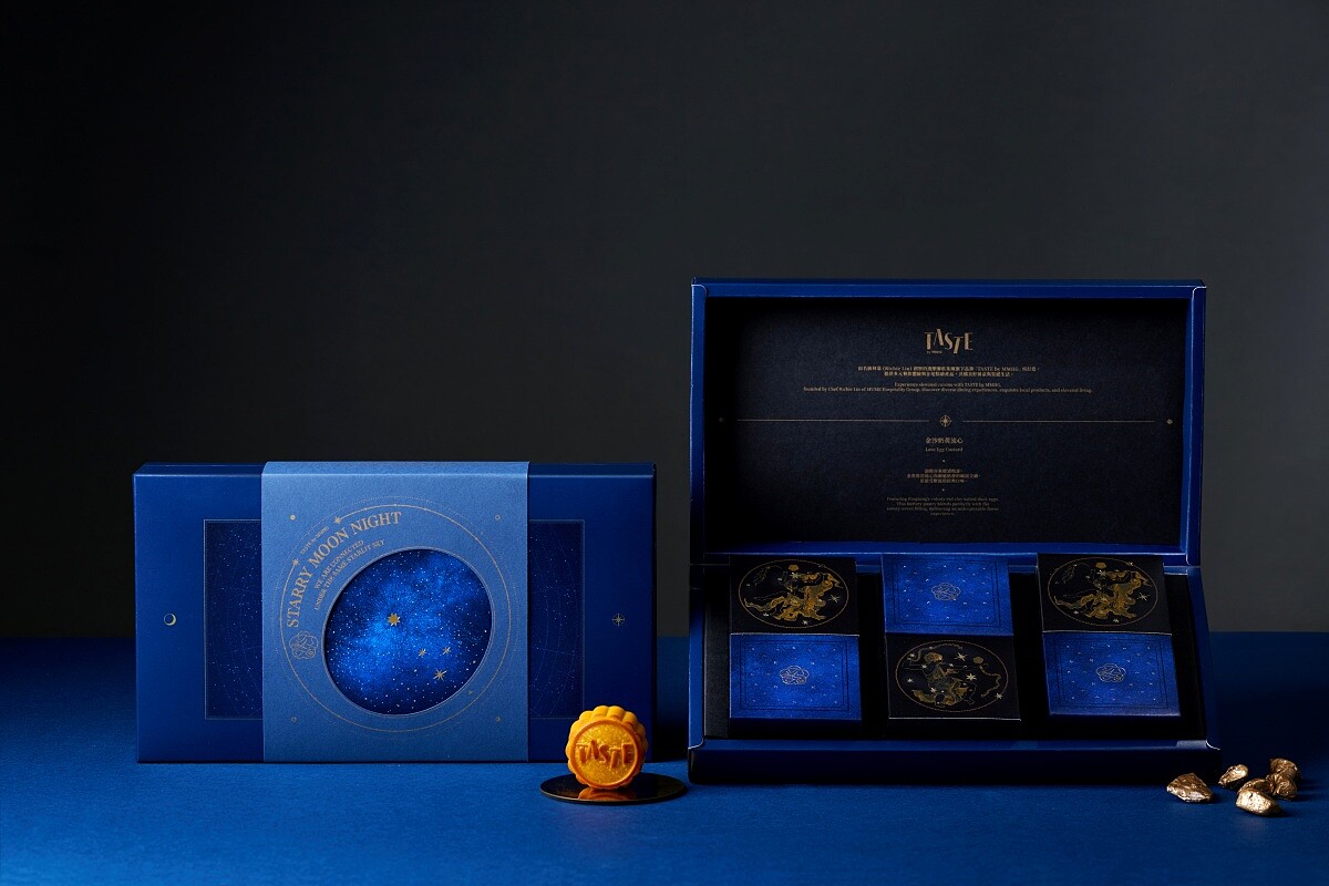MMHG湘樂餐飲集團旗下電商品牌「TASTE by MMHG」今年再度與沖煮冠軍咖啡師王策的品牌「VWI by CHADWANG」合作,推出「月映星夜 Starry Moon Night」聯名禮盒。禮盒包裝十分精美且設計顛覆傳統,此次以星象盤為主題,在靛藍盒面上燙金星空圖案,展現精緻感。內層則延續星空主題,每個分裝盒用希臘神話圖騰描繪月餅口味。咖啡濾泡包則以黑金色包裝,象徵夜空與星斗,品嘗時彷如觀賞星象變化。
