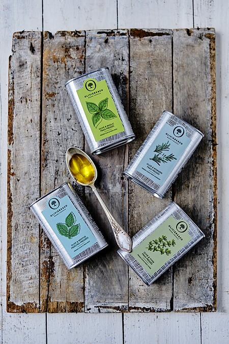 除此外,O&CO 風味橄欖油有多款選擇,皆以義大利傳統工法萃製,在榨油的同時直接加入水果、辛香料或香草一起萃取,呈現與其他浸泡式的調味橄欖油截然不同的品質和口感。品項多元,有大蒜、辣椒、迷迭香、百里香、薄荷、羅勒等風味,都是烤物料理的調味神助手,特別是在戶外露營時,只要一罐在手就可立即添香,省卻張羅新鮮蔥、薑、蒜來爆香的麻煩。