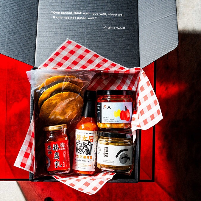 內容:PÀNG 手工炸塔可餅、LOUU 梅漬苦瓜(新品)、LOUU 油漬香料番茄 or 榛果甜椒、辣太后辣醬麻油辣腐乳、PÀNG 豆腐乳莎莎醬食譜卡 售價NT980元(可另外加購「油漬煙火魚」)