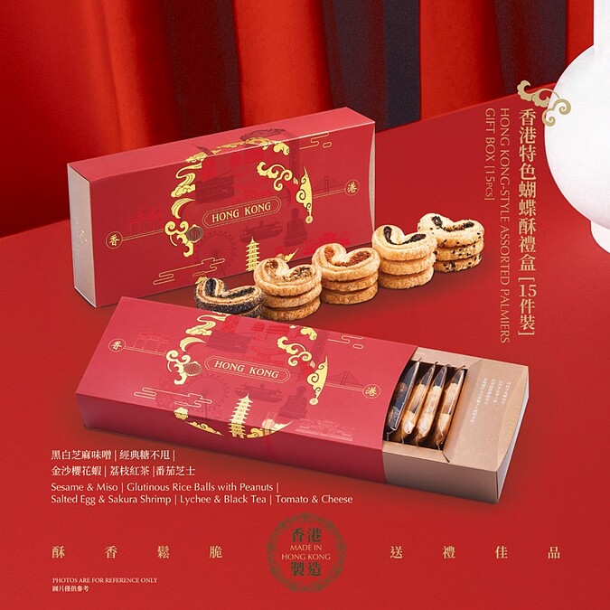 為迎接中秋特別推出了「香港特色蝴蝶酥禮盒」!內有「黑白芝麻味噌」「經典糖不甩」「金沙櫻花蝦」「荔枝紅茶」「番茄芝士」五種創新口味,加上精美包裝展現香港的多元文化和歷史韻味,外觀印有香港景點和燙金祥雲圖騰,內部精心排列蝴蝶酥,確保送達時完美無瑕。不僅只有美味,也展現了香港獨特風情與經典風味。