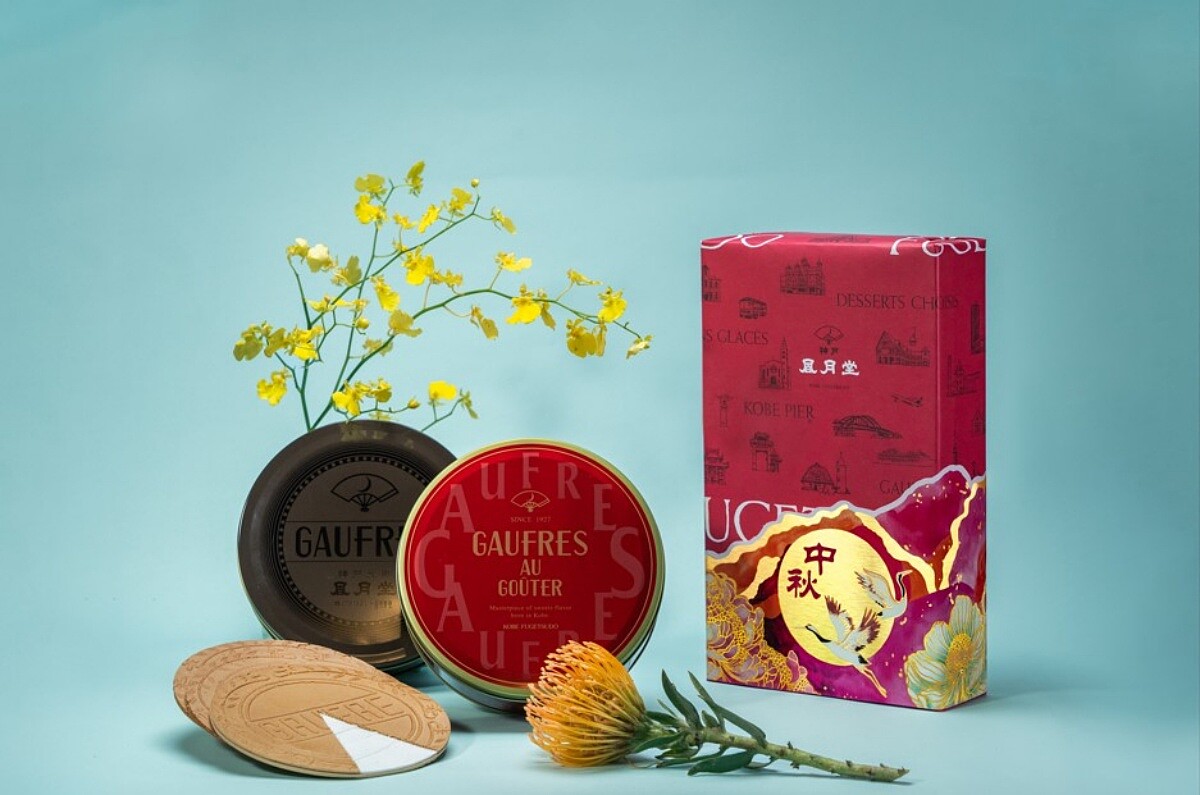 日本百年銘菓神戶風月堂為台灣中秋節推出「棕紅綜合禮盒」,外觀設計結合了飛鶴、牡丹、月兔和圓月,象徵祝福與圓滿。內含明星商品經典法蘭酥鐵盒、大圓經典法蘭酥、可可奶油圓餅乾、香草薄脆煎餅和紅茶捲餅乾,展現了品牌的優雅與創新。