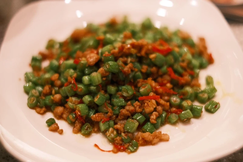 四季豆去除粗筋切丁,潤鍋後放入絞肉快炒爆香,調味後收汁,四季豆口感爽脆、鹹甜入味。
