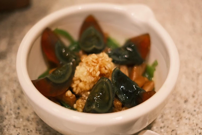 這是一道湖南經典開胃涼菜,將羊角椒、青辣椒表面燒成虎皮微焦,加入皮蛋、削皮茄子,和特製醬料搗勻。