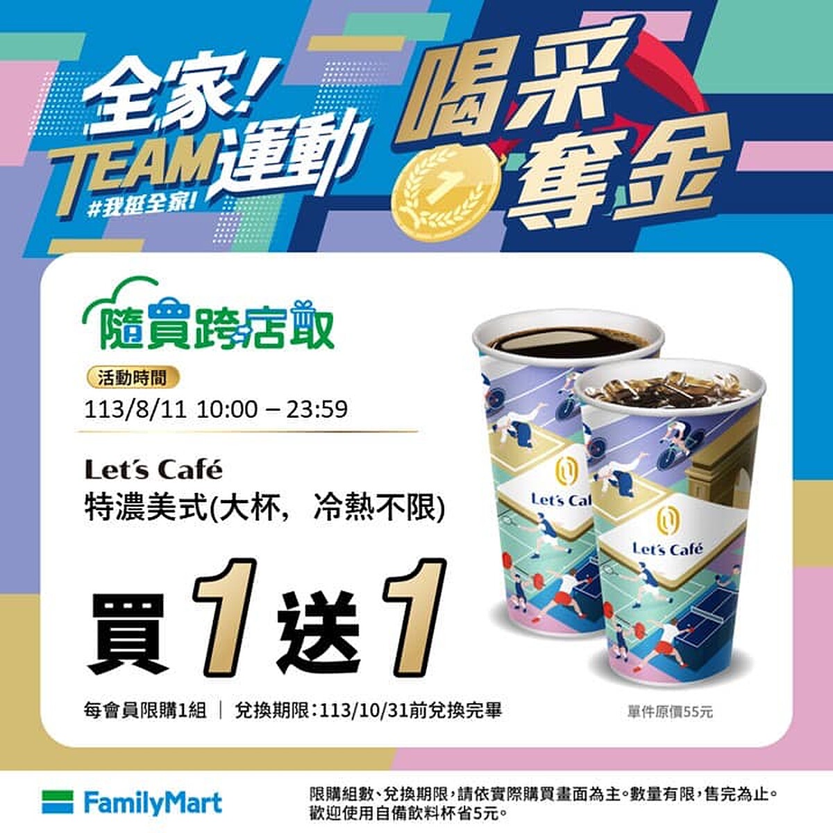 即日起至8/20推出礦沛氣泡水585 mL(原單件售價25元)買1送1、黑嘉麗軟糖綜合水果(原單件售價45元)買1送1;以及即日起至8/12Hi café大杯系列的美式咖啡(原單件售價45元)或拿鐵咖啡(原單件售價55元),可冰/熱任選享同品項買1送1、濃巧脆脆雪糕/焦糖脆脆雪糕(原單件售價40元)任選買1送1的優惠。