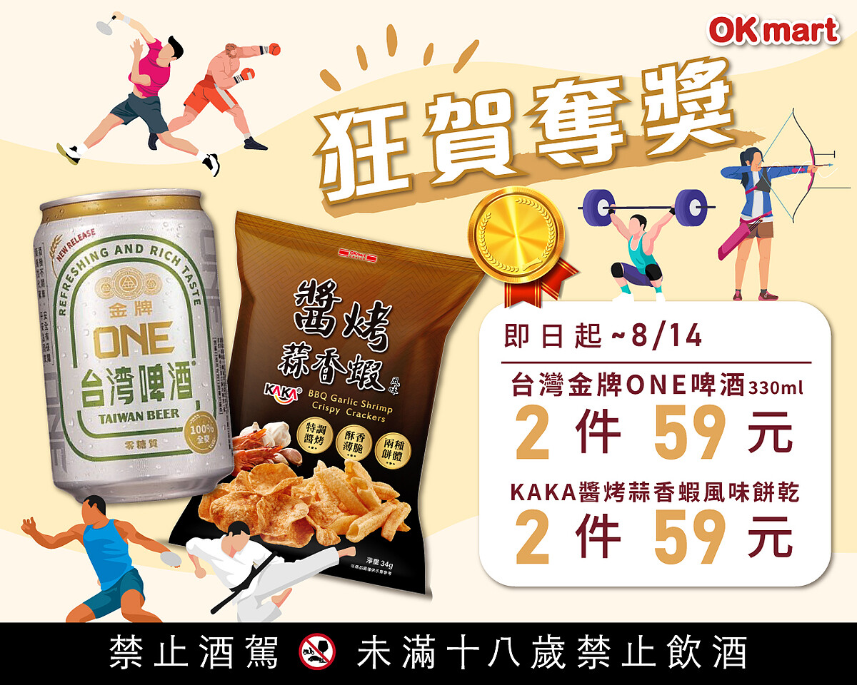 即日起至8/14台灣經典啤酒500ml享2件72元、台灣金牌啤酒 500ml享2件85元、台灣金牌ONE啤酒 330ml享2件59元、KAKA醬烤蒜香蝦風味餅乾享2件59元。