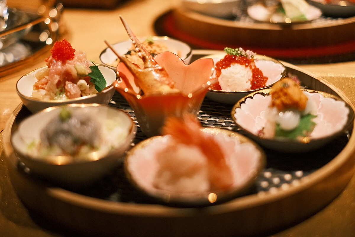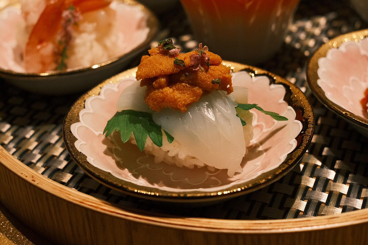 喜愛品嚐滿滿海鮮味的小資女看過來~前三品「海膽紫蘇墨魚」、「赤蝦紫蘇球壽司」、「魚卵球壽司」新鮮又鮮甜,一口吃下去都是大海的滋味,後三品則是「松葉蟹天婦羅」、「銀魚湯漬飯」及「鮭魚湯漬飯」,還可以在嘗試抹茶與鰹魚熬製而成的高湯特色吃法,七品一套售價999元,微風信義店限定推出。