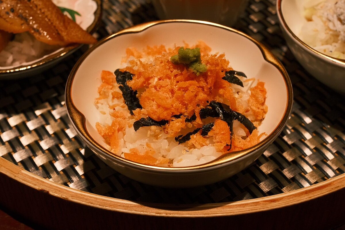 接受可以品嚐後「松葉蟹天婦羅」、「銀魚湯漬飯」,「鮭魚湯漬飯」則可以吃到一半加入特製抹茶鰹魚高湯,烤鮭魚鬆及銀魚搭配精選日本靜岡特產抹茶與鰹魚煮製而成的高湯帶出鮮味,不同的吃法增添用餐樂趣,六品一套售價699元,Sogo復興店限定推出。