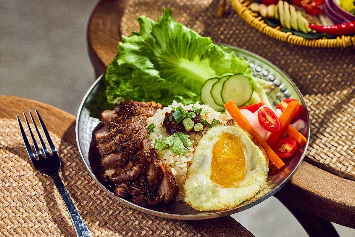 為中餐招牌,選用玉里蓮貞豚,經過香茅、自煉油蔥、蝦醬、魚露和辣味醃製,再配以越式風味醬油和台東米飯,味道豐富令人回味。