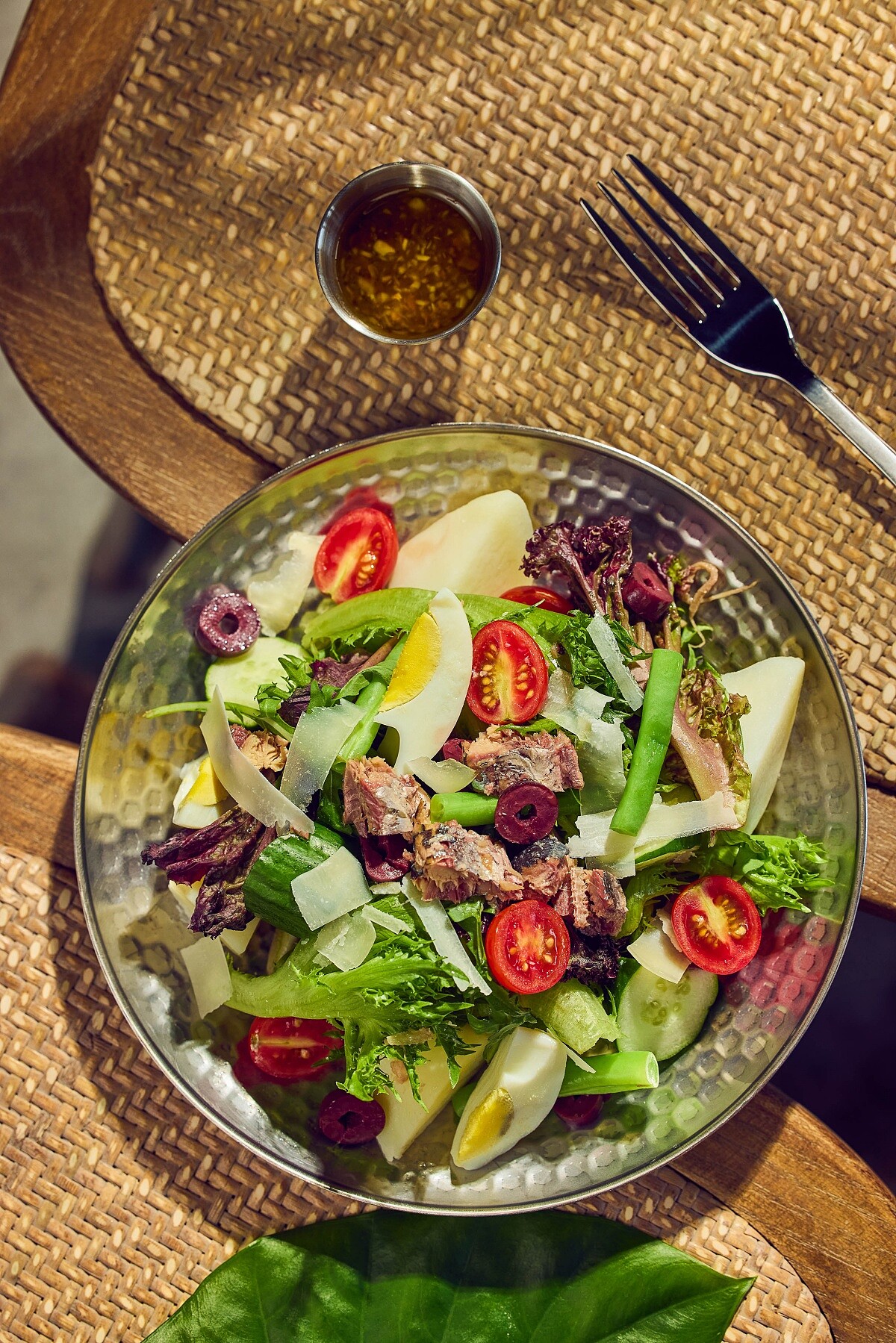 輕食首推「老船長尼斯沙拉」,使用宜蘭特有的「油漬鯖魚魚腹」和清爽在地蔬菜,結合法國經典尼斯沙拉和地方食材。