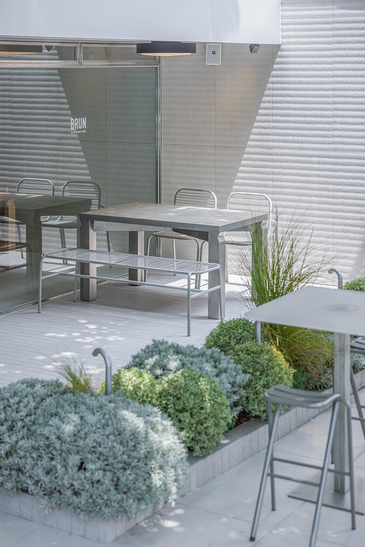BRUN不然天母店從室內外空間的比例配置、空間風格到天母街區的悠然氣氛,兼具城市的時髦與悠閒氣質,正是不然最想傳達的餐飲風格,新分店在設計上,特意打造了沒有距離感的用餐體感,找來「彡苗空間實驗」與用光影說故事的「瓦豆」一起打造室內空間,開放式的廚房與回字形的座位設計,更輕鬆地拉近人與人之間的距離。