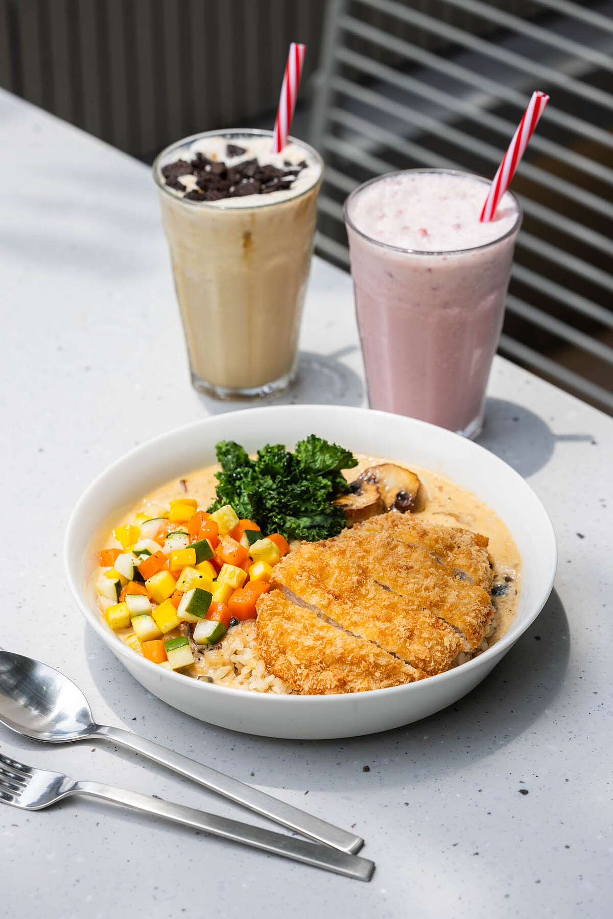 以「提供簡單又富有深度的美味餐點」為經營理念,BRUN不然天母店這次在菜單中推出向天母知名美式漢堡店致敬的「美式豬排飯」與「經典奶昔」,其中「美式豬排飯」金黃酥脆的豬排,搭配上特製的辣芒果醬汁,水果的酸甜加上些許的辛香料,是香濃清爽又飽足的料理。