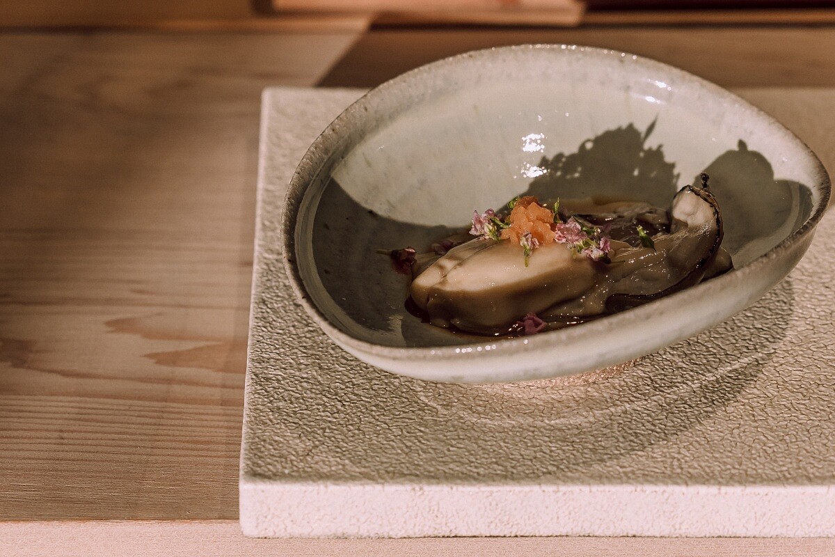 肥美的生蠔以紫蘇、橙醋、辣蘿蔔泥搭配,最後點綴上清香的紫蘇花。而橙醋主廚有另外以柴魚高湯調製熬煮,因此風味更為豐富,提升的生蠔鮮甜的滋味。