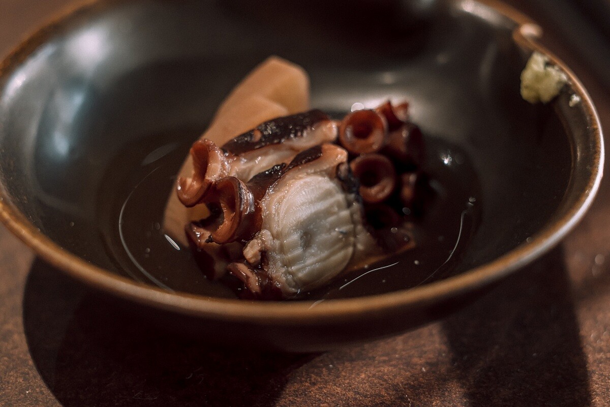 使用紅豆燉煮章魚,讓其增色美觀,一旁則有山葵、白蘿蔔,能一起搭配使用,鮮美甜鹹柔和風味,是道非常傳統的下酒小菜。