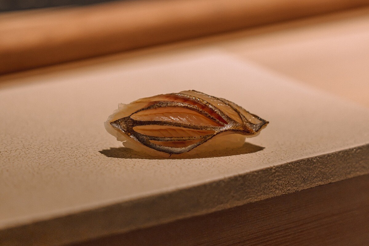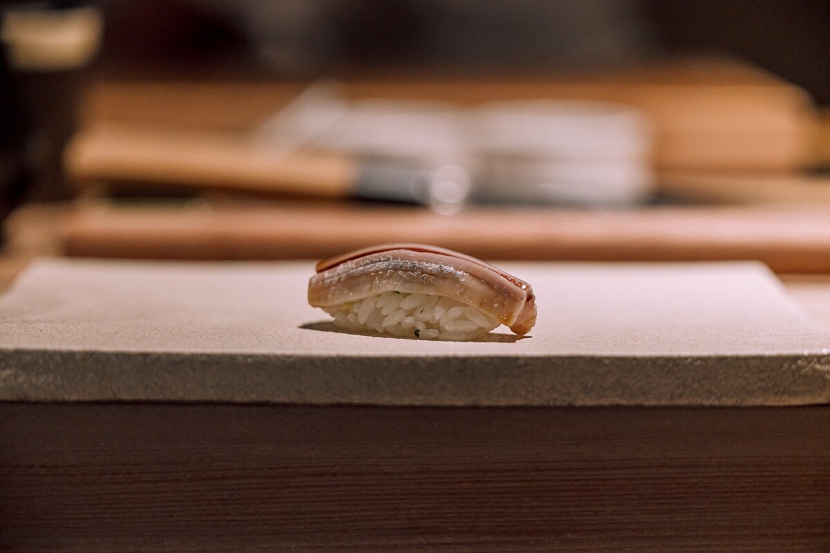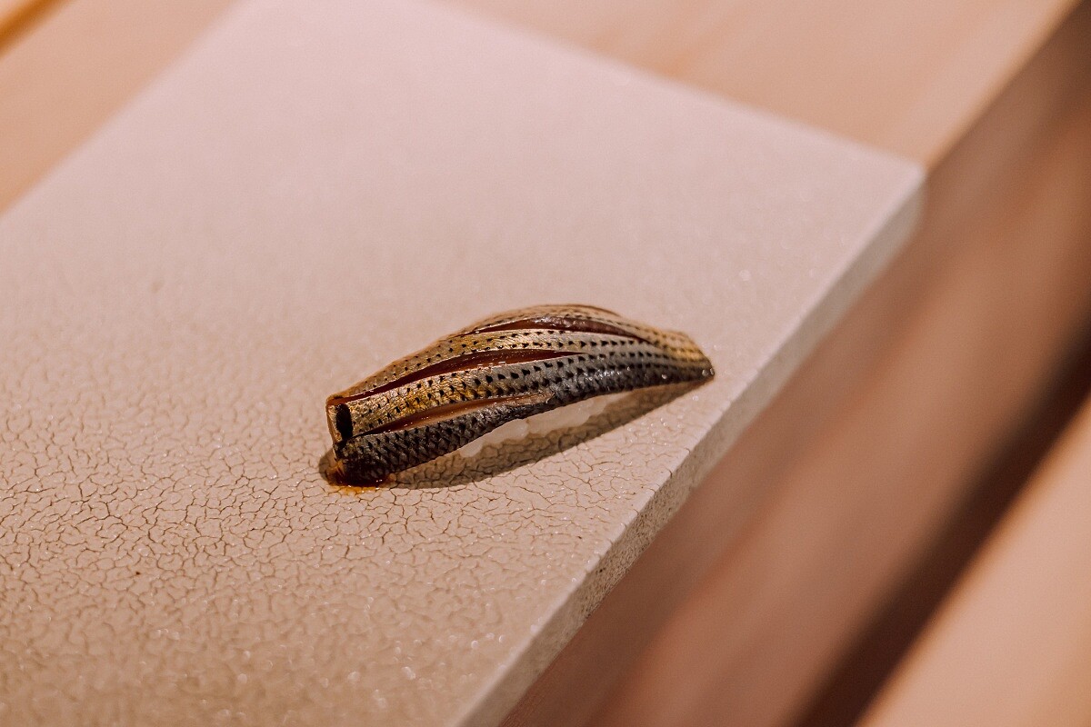 使用來自鹿兒島的小肌魚,先後以鹽、醋淺漬,如此一來能讓魚肉減低腥味,也讓細小的魚刺軟化,緊實卻又細膩的肉質,讓人一改對亮皮魚的刻板印象。