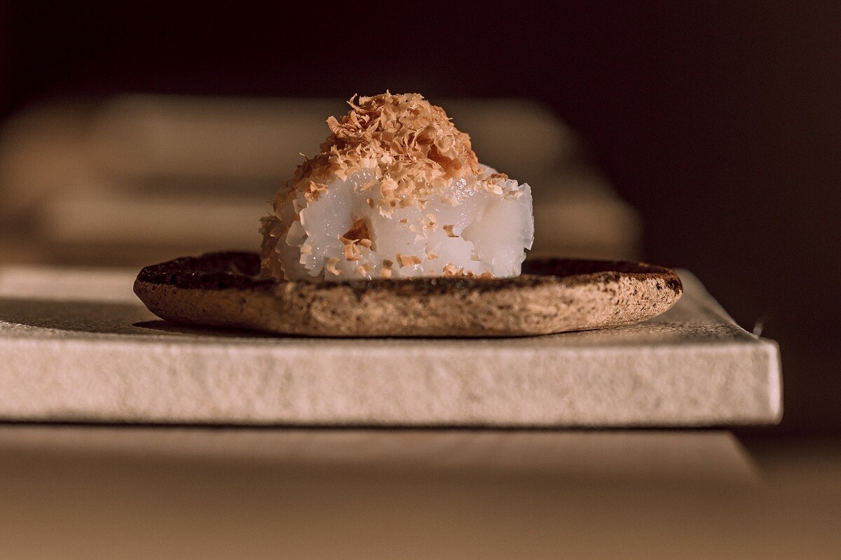 此魚種是在日本相對少見的食材,由於疣鯛的捕撈難度高且數量稀少,因此它在市場上價格昂貴,因此被視為高檔料理中的珍品,這種食材也考驗著廚師的技藝。主廚特地選用台灣產的疣鯛,體型小但肉質細緻,風味也更為濃郁。