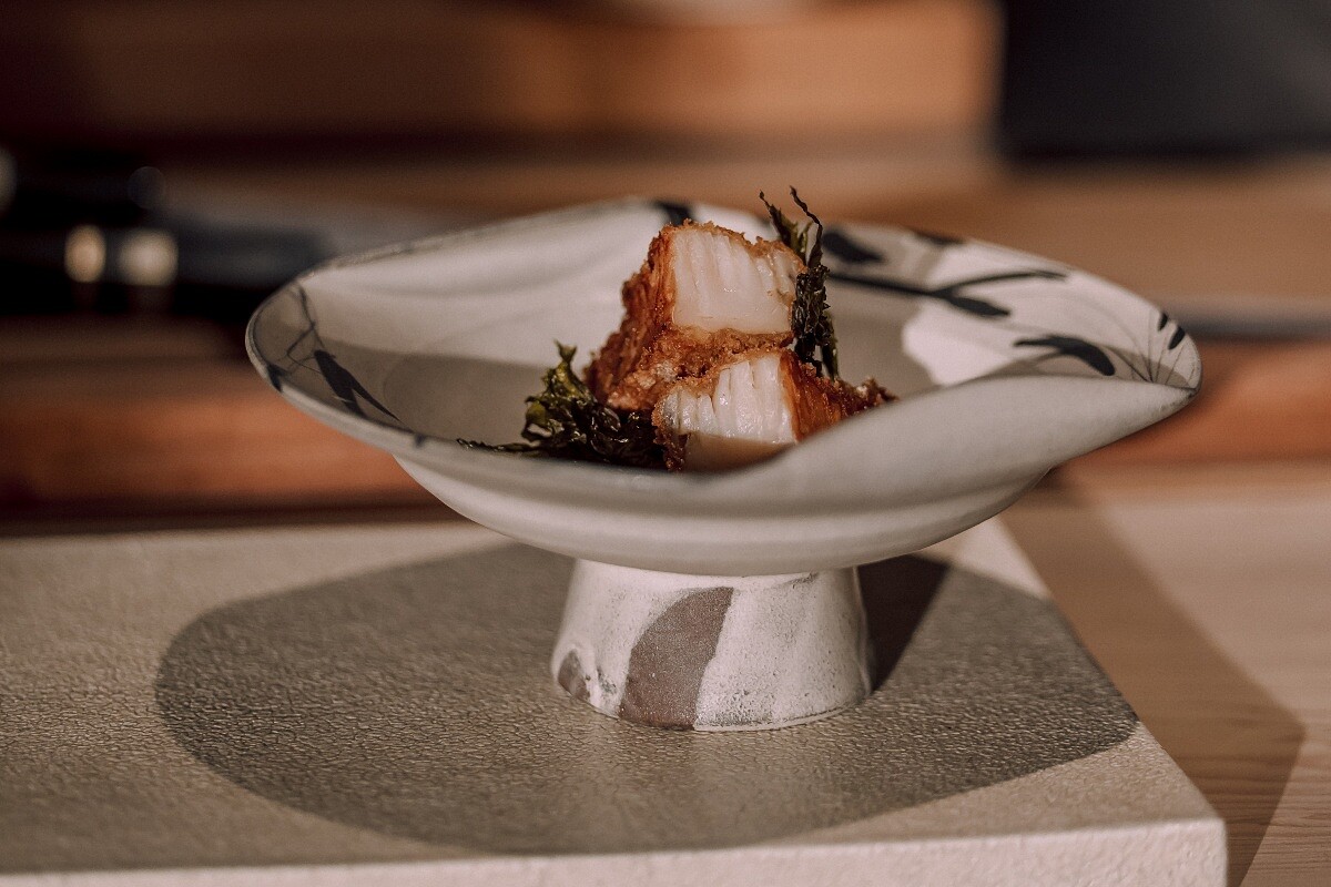 使用南非活鮑魚,先燉煮軟嫩後再包裹米果油炸,一旁則有來自澎湖的紫菜酥,以芝麻油增添香氣烤製。這道料理展現了割烹師傅掌控溫度的功力,才能保持鮑魚外酥內軟的口感。