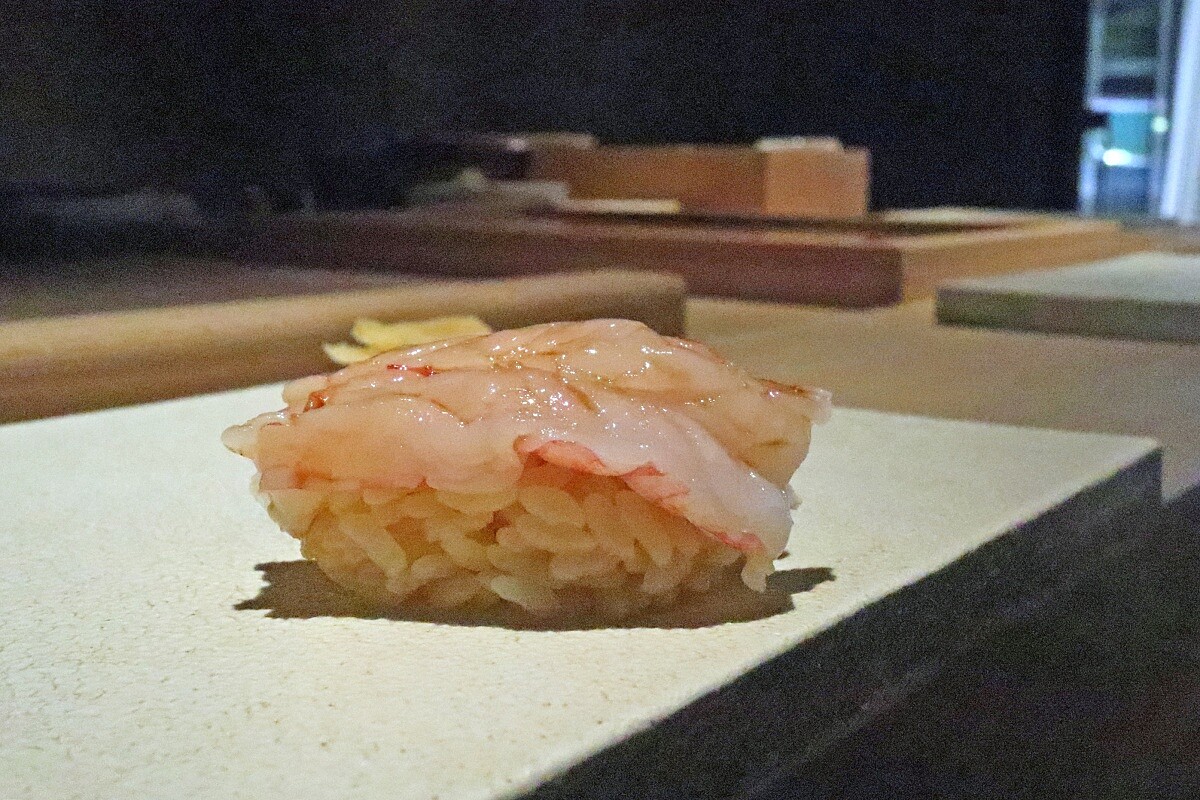 使用來自日本兵庫的甜蝦,柔軟而多汁,每一口咀嚼時,細緻的肉質與淡淡的甜味在口中層層展開。主廚特以開背的方式處理,讓蝦肉與醋飯做更好的結合。