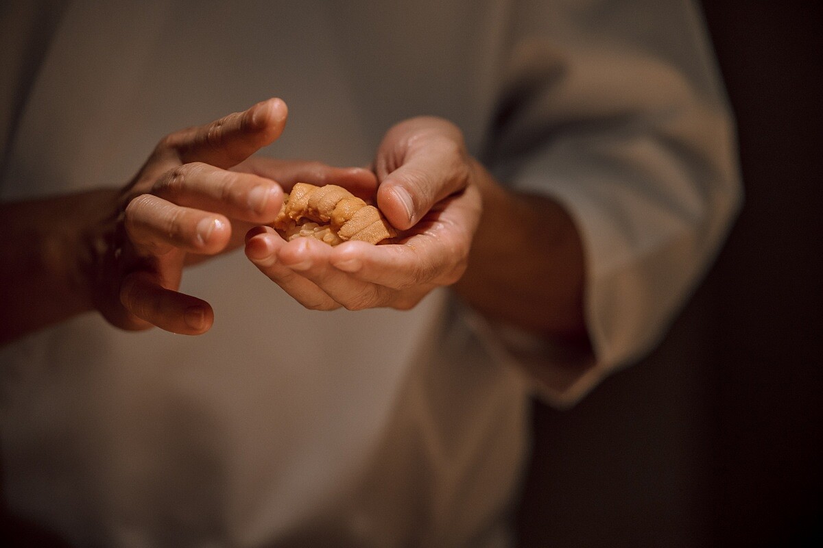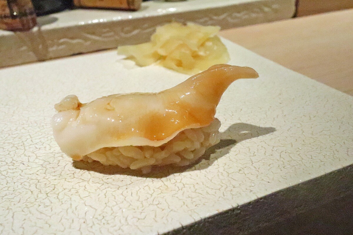 此品握壽司的醋飯不僅僅是醋飯,還加入了海膽拌在一起,讓每顆米粒都與海膽的風味融合在一起,豐腴的海味讓人回味無窮。