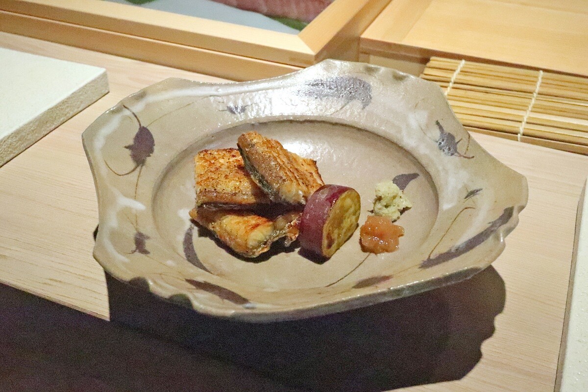 使用白鰻先以少量的鹽調味,用烤製的手法將其呈現酥脆的口感,再擦上薄口醬油、味醂增添香氣,同時也帶來富有食慾的色澤。一旁則有日本金時地瓜糊,帶有迷人的栗子香氣,也能搭配盤中的山葵、南高梅醬,增添食用的樂趣。