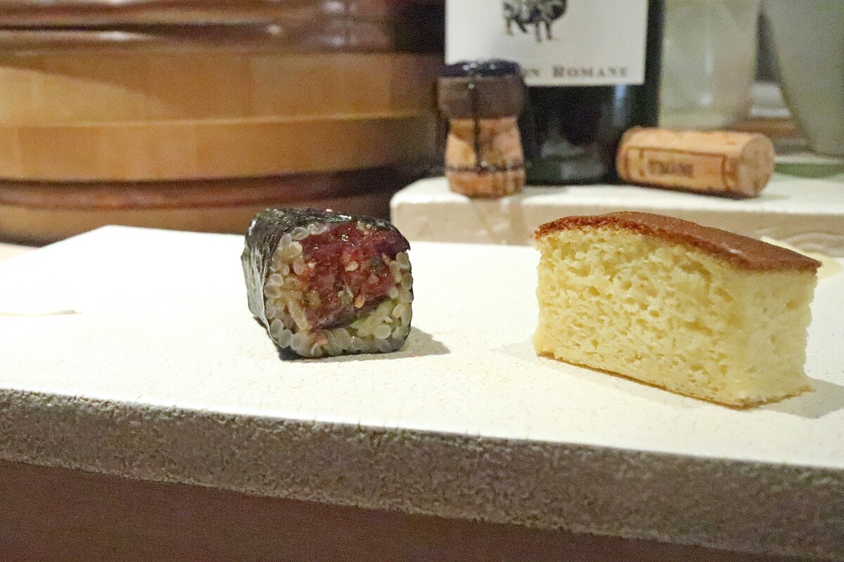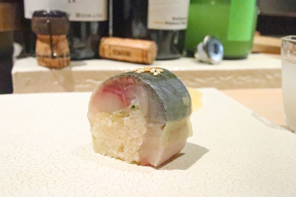 鯖魚部分以關西風格的押壽司來表現,使用白板昆布將醋飯與魚肉包裹在一起,昆布釋放的鮮味能讓整體更為和諧。