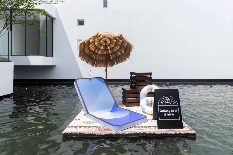 在「Galaxy AI 期間限定體驗店」中必須打卡拍美照的包括戶外的「Galaxy Z Flip6造型打卡框」、「戶外水池區」、「Galaxy Z Flip6造型躺椅」等,只要透過Galaxy AI功能,即可輕鬆與池中躺椅完美合照,拍出仿若置身於海島度假之中。